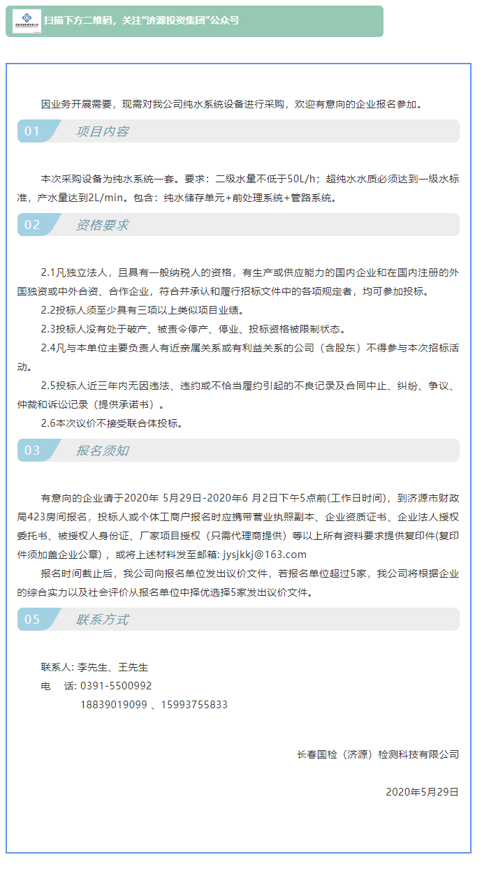 長春國檢(濟源)檢測科技有限公司采購純水系統(tǒng)競爭性議價公告